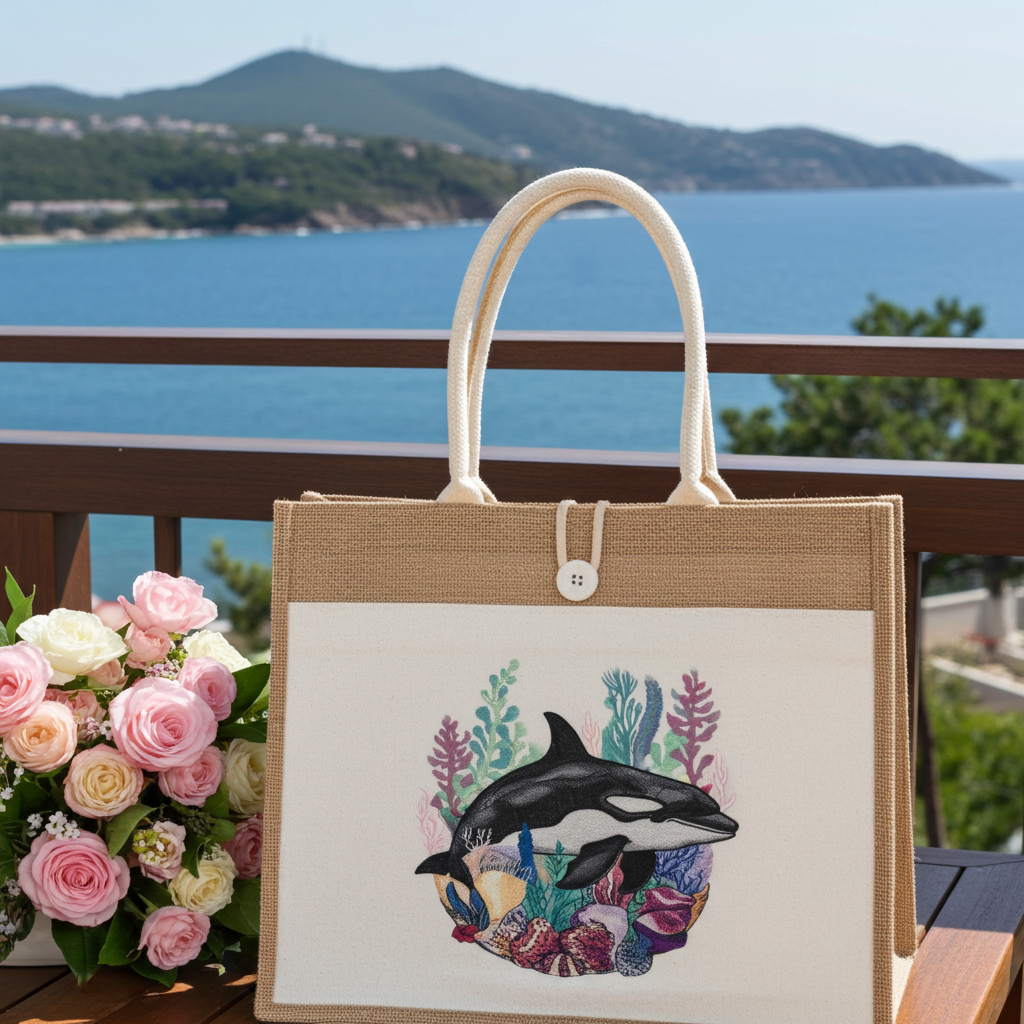 باليه تايد وفن: حقيبة جوت مطرزة بنقشة حوت قاتل وشعاب مرجانية - أناقة محيطية بخيوط مستدامة