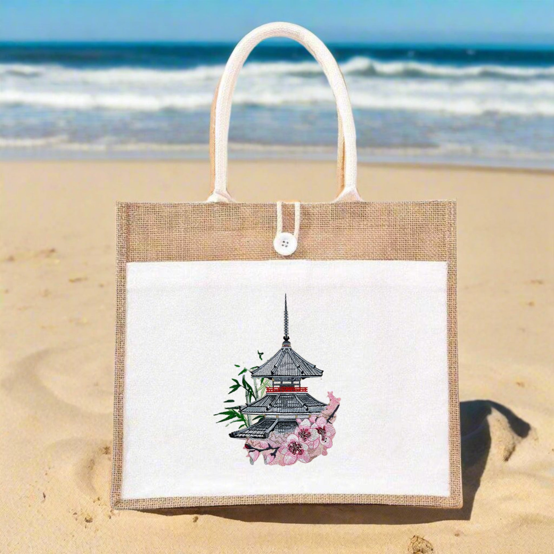 قمة السكينة: حقيبة أنيقة من الجوت مطرزة بزخارف الباغودا وأزهار الكرز - إبداع فني شرق آسيوي خالد بخيوط مستدامة